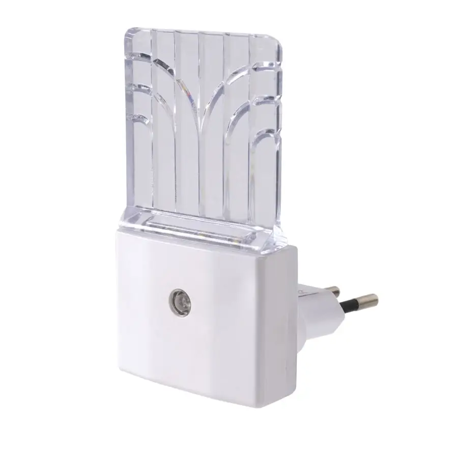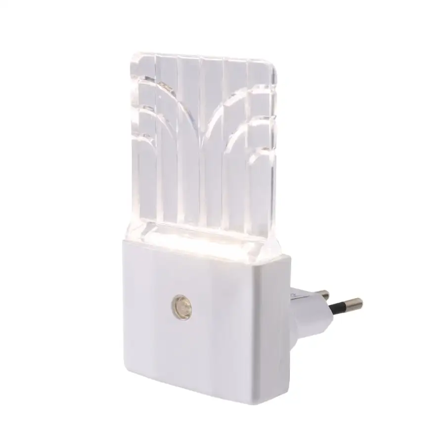 The night light equipped with a twilight sensor turns on in the dark automatically when the light is connected to the socket. The color tone of the LED light is warm white (3000K). Takes up a little space. The material is plastic, the light part is textured transparent acrylic. Light source led 3 pcs 0.5W 5lm, 3000K. Enclosure class IP20, use in dry interiors.