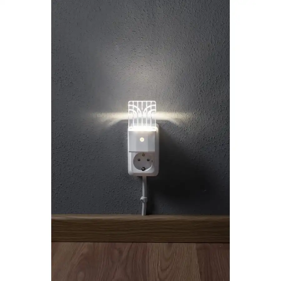 Nattlampan utrustad med skymningssensor tänds i mörker automatiskt när lampan ansluts till uttaget. Färgtonen på LED-lampan är varmvit (3000K). Tar lite plats. Materialet är plast, den lätta delen är strukturerad transparent akryl. Ljuskälla led 3 st 0,5W 5lm, 3000K. Kapslingsklass IP20, använd i torra interiörer.