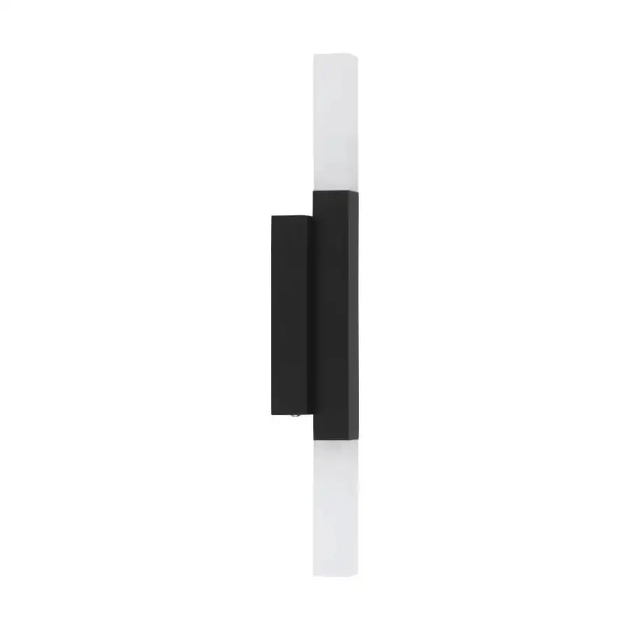Black central part, from which two plastic, warm white light diffusing domes of integrated LED light sources come out. The right lamp for both above the mirror and as a wall lamp for other rooms in the home.