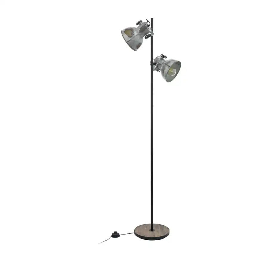 The BARNSTAPLE floor lamp features a black metal base with a round, brown wood grain finish panel surrounded by a black metal band. The distressed steel look of the two adjustable heads and the black fixing screws mounted on the sides of the shades round off the light’s rustic design. The lamp can be switched on and off easily using the in-line floor switch. The floor light blends seamlessly with the trendy industrial style and its pivoting heads make it ideal for any space, whether it’s in the bedroom, living room, dining room or hallway. The product requires 2 x E27 lightbulbs that are not included.
