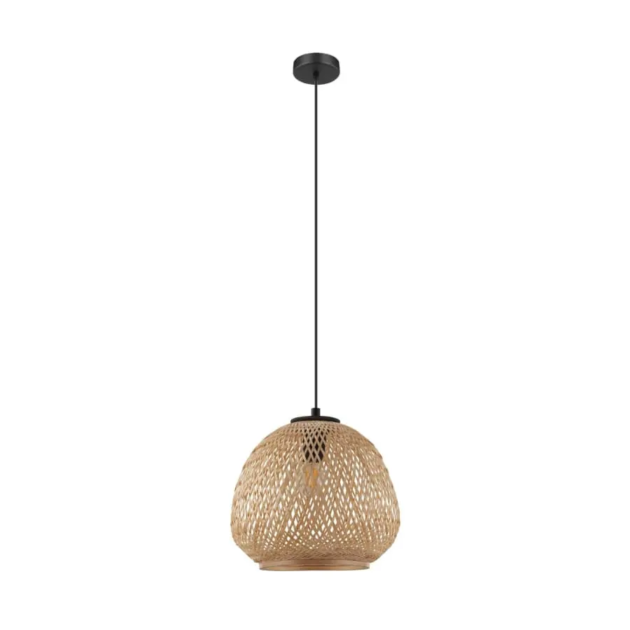 The DEMBLEBY pendant light features a black metal structure with a natural wicker lampshade. The woven pattern of the lampshade conjures up a fascinating play of light and shadow on the ceiling and wall. The pendant light blends seamlessly with trends such as vintage, natural, boho and hygge. It provides cosy lighting for any space, whether in the kitchen, in the living room or above the table in the dining room. The pictured filament lightbulb is not included. The product has an E27 lamp holder and requires 1 E27 lightbulb.