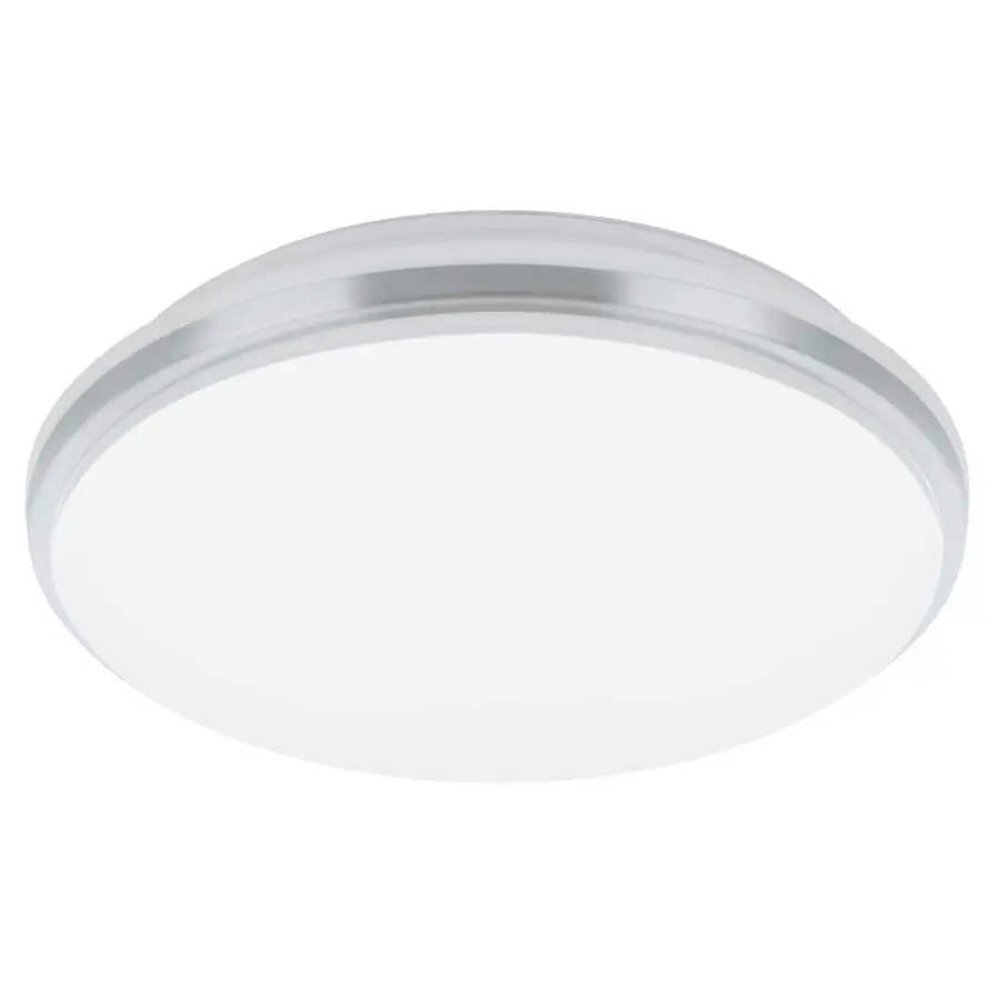 The PINETTO LED ceiling light features a round white plastic cover paired with a chrome-coloured plastic frame. The product is suitable for use in the bathroom due to its IP44 protection against spray water, and the integrated LEDs produce a bright neutral white light. With its classic design and diameter of 34 cm, the ceiling light blends into almost any interior and works well in any living space where good lighting is required, such as the bathroom, kitchen or hallway.