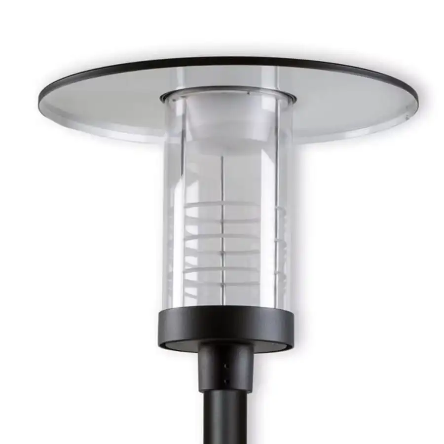 The cap and base of the Maestro pole lamp are powder-coated aluminum. The dome is UV-stabilized clear polycarbonate and the glare shield and decorative rings are acrylic. The height of the lamp is 469 mm and the diameter is 590 mm. The weight of the LED outdoor light is 5.6 kilograms. The ambient temperature of the pole lamp is -40-+30°C and its enclosure classification is IP65, making it perfectly suited for outdoor spaces. The strength class of the light’s mechanical impact resistance is IK10, which therefore guarantees resistance also against vandalism.