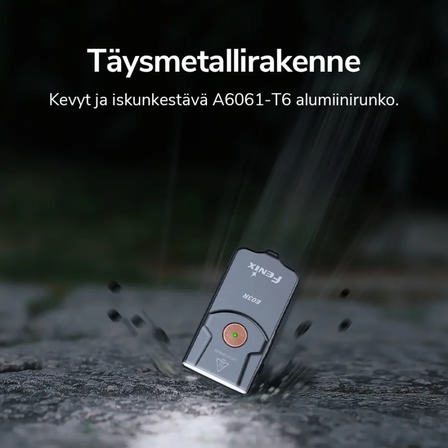 Den kraftfullaste minificklampan någonsin. Det är lätt att kalla Fenix E03R för en superminilampa eftersom det är den mest kraftfulla och mångsidiga Fenixs riktigt lilla nyckelringslampan genom tiderna. Denna ultrakompakta ficklampa ger en bländande max. 260 lumen ljusstyrka och den lyser jämnt och brett upp till max. upp till 42 meter. Utöver det vita ljuset är det speciella med E03R dess röda specialljus, vilket ytterligare utökar användningen av lampan, t.ex. bibehåller användarens synförmåga i mörker. Lampans hållbara helmetallkonstruktion säkerställer utmärkt hållbarhet i dagligt bruk. Lampan manövreras från en av dess stora tryckknappsbrytare. Med den snabba och hållbara USB C-laddningskontakten kan du snabbt ladda lampan och återställa den till fungerande skick när batteriet tar slut.