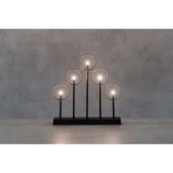 5-haarainen kynttelikkö viidellä lämminvalkoisella LED-valolla ja 6h On/18h Off- ajastimella. IP20. Vain sisäkäyttöön. Toimii 2 x AA- paristolla(eivät sisälly pakkaukseen). Paristokotelo on kynttelikön jalassa.