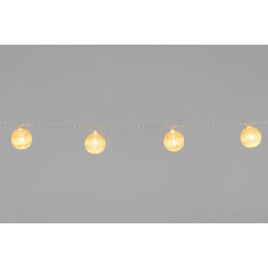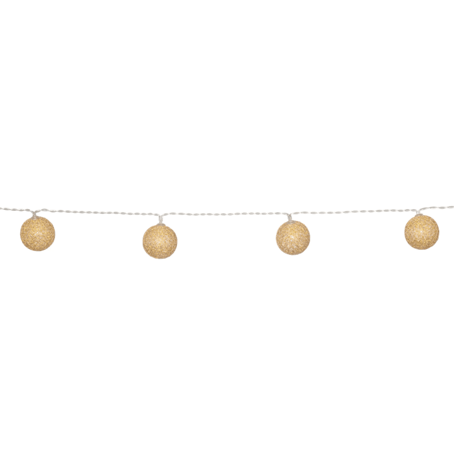 16 gold -colored cotton ball, every 15 cm. Connecting cable 3 m. Transformer 220-240V 50-60Hz 300MA, 3.2V 50Hz 0.96W, IP20. Only for indoor use. Includes 16 plastic clips for attachment.