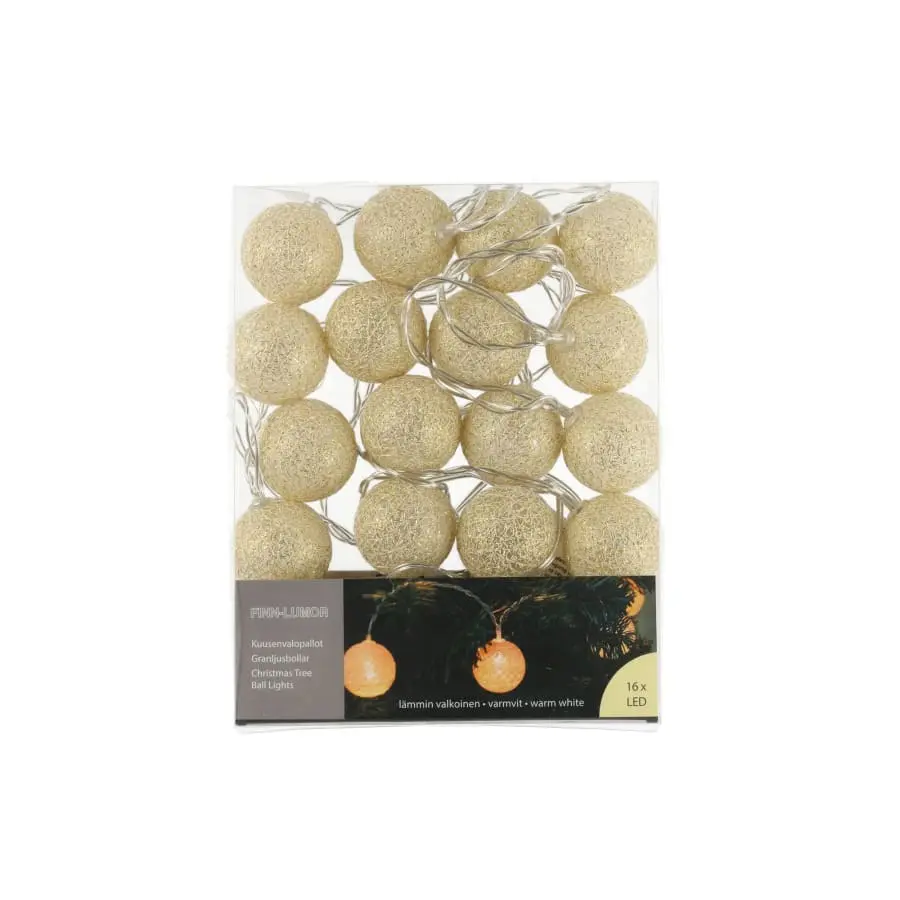 16 kpl kullan väristä puuvilla palloa, 15 cm välein. Liitosjohto 3 m. Muuntaja 220-240V 50-60Hz 300mA, 3,2V 50Hz 0,96W, IP20. Vain sisäkäyttöön. Sisältää 16 muoviklipsiä kiinnittämiseen.