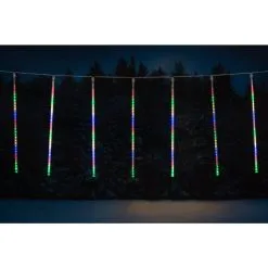A spectacular light series of light sticks. Colourful lights moves up and down. 10 pcs Glowsticks 50 cm, each with 30 LED lights, in total 300 pcs. Sticks with red, green, yellow and blue LEDS. Transformer 4.5V, 2,25W, IP44. Light tube distance 20 cm. Cable 5 m. Indoor and outdoor use.