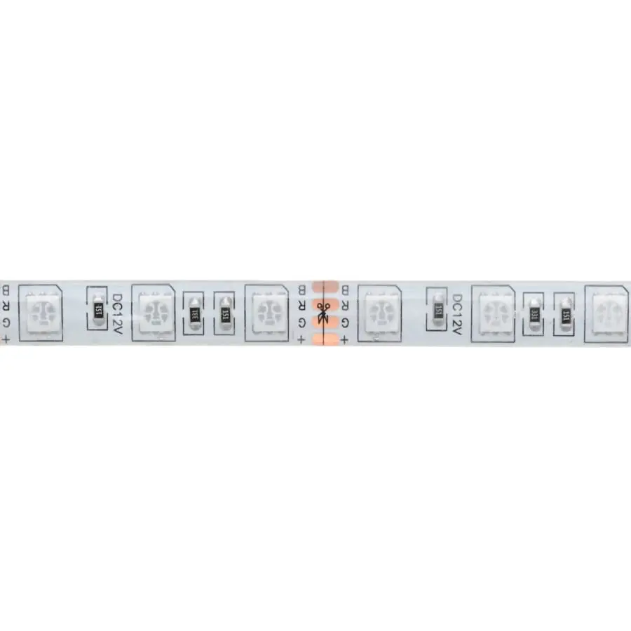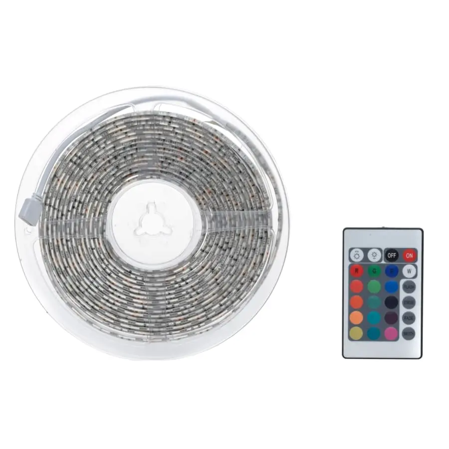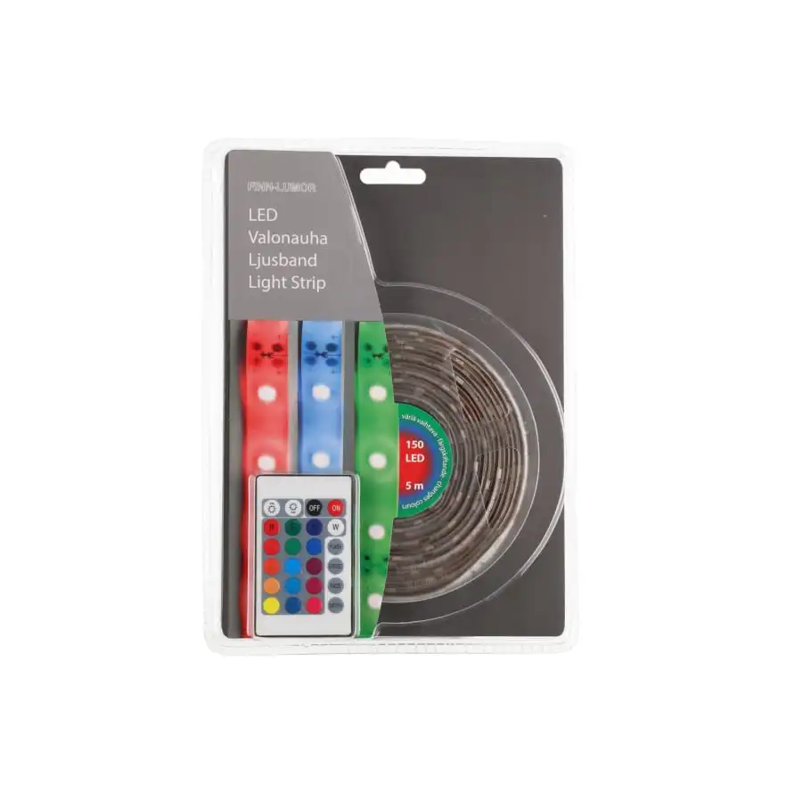 The RGB LED strip has 150 SMD LEDs. The strip light is remote controlled and colour-changing, with an IR remote control to dim the light, change the shade or make the light colour change from flashing to slowly changing. Technical information: 150 SMD-LED strip. Remote control and colour changing. Can be shortened at marked points. 2 m with connecting cable. Remote control IP20. Transformer 12V 18W, IP44. For indoor and outdoor use.