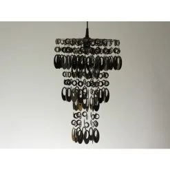 Hänglampa med svarta plastdekorationer och en metallisk krom kropp. Hängen reflekterar ljuset vackert och lampan kan förses med en E27-lampa. Diameter 32cm och maxhöjd 120cm. Fästs på krokfästet. Tillverkad i EU.