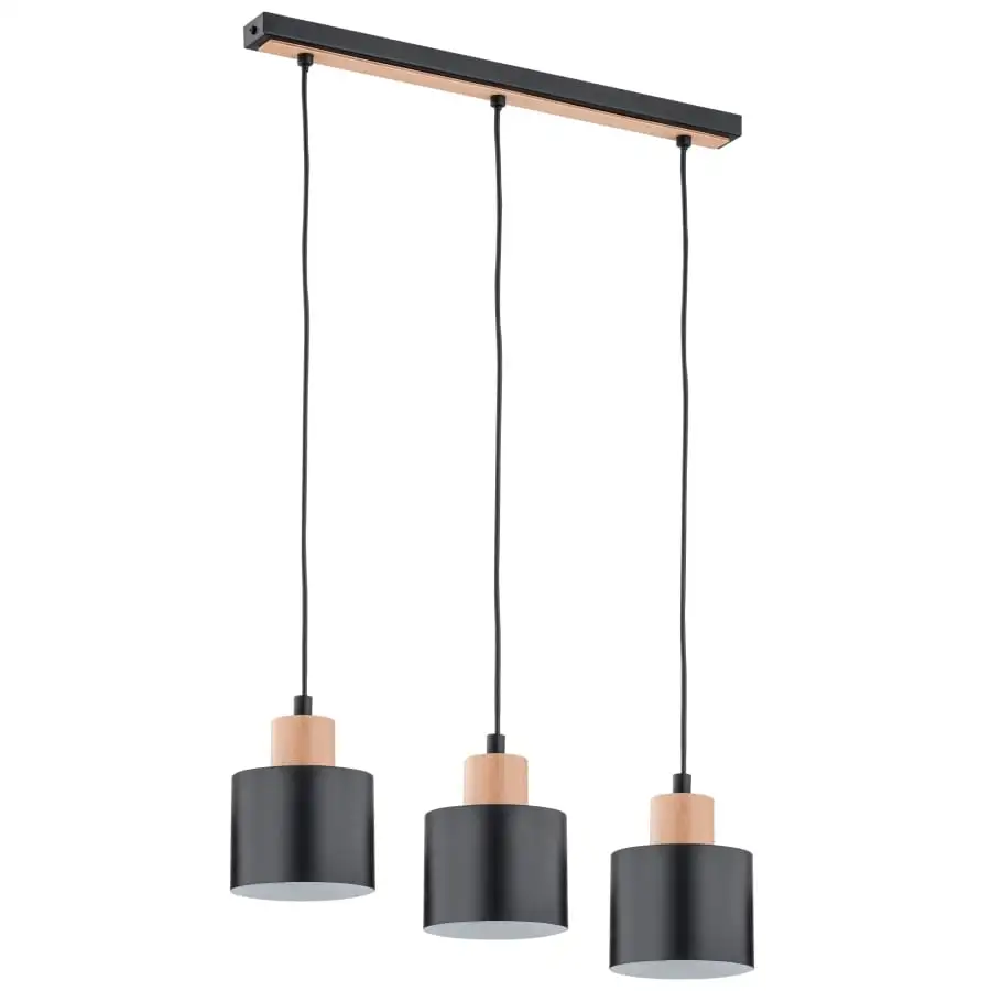 A stylish three-part pendant lamp, the height of the dome can be adjusted to the desired height. Above the metal domes are wooden parts. The lamp reflects light directly downwards and fits well, for example, on top of dining tables. The lamp is attached directly to the ceiling using screws. Light output 3xE27, bulb not included in the package. Width 52cm, depth 12.5cm and height 90cm. The lamp is manufactured in the EU.