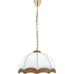 Nostalgisk taklampa med vita böjda glas och trädetaljer. Den guldfärgade kedjan ger en festlig atmosfär och är lätt att fästa på krokfästet. Ljuseffekt 1xE27, glödlampa ingår ej i paketet. Diameter 37cm och höjd 74cm. Lampan är tillverkad i EU.