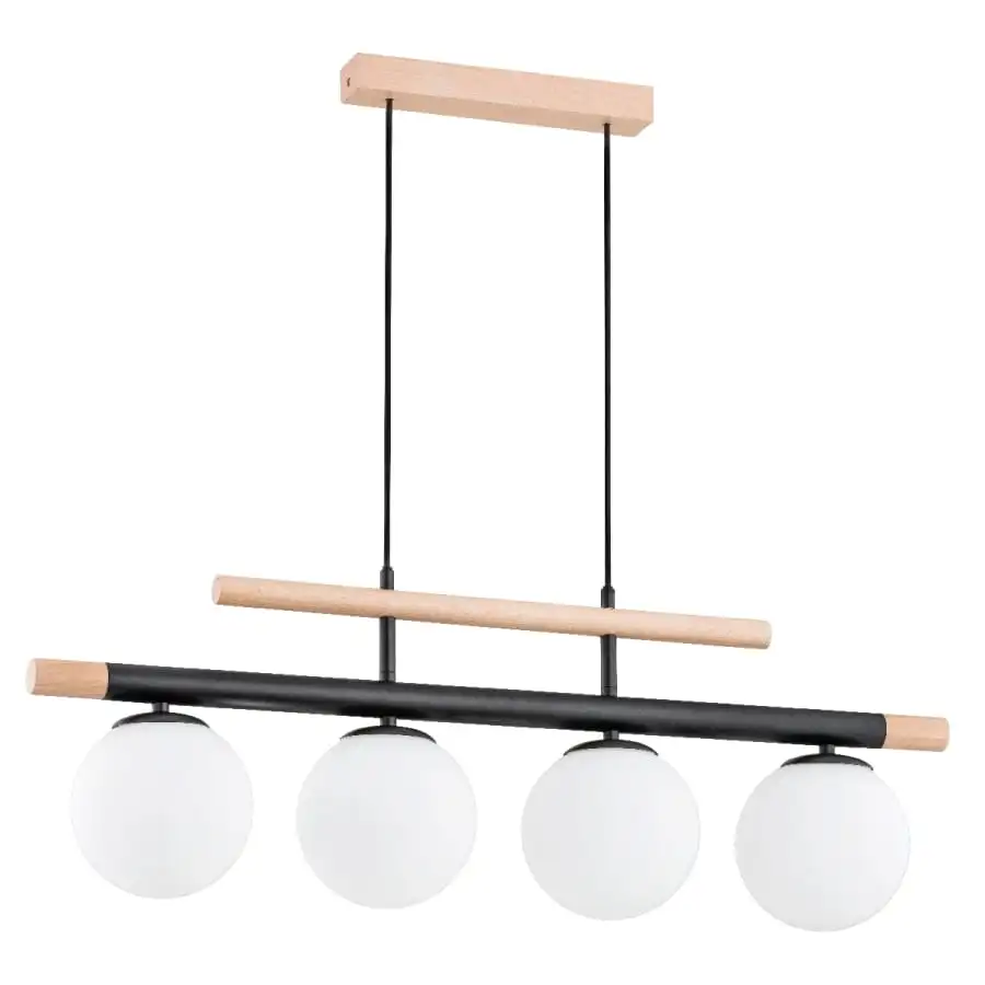 Cozy hanging lamp with four white glasses. The wooden frame gives the lamp an atmospheric appearance. The lamp is attached to the ceiling box with screws. Diameter 82cm and height 85cm.