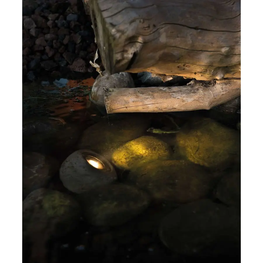 En spotlight med utseendet och vikten av en natursten som kan installeras till exempel i en fontän eller strandvatten. Med denna kraftfulla LED-spotlight kan du lyfta fram buskar, statyer eller ett vattenmotiv.