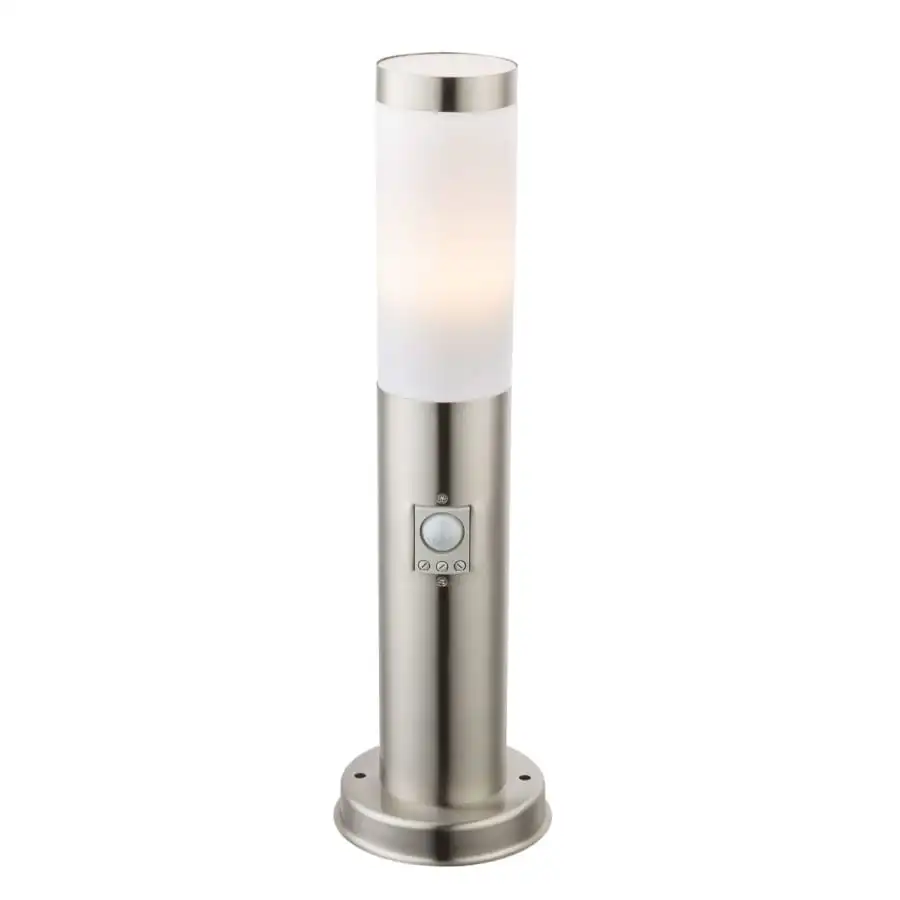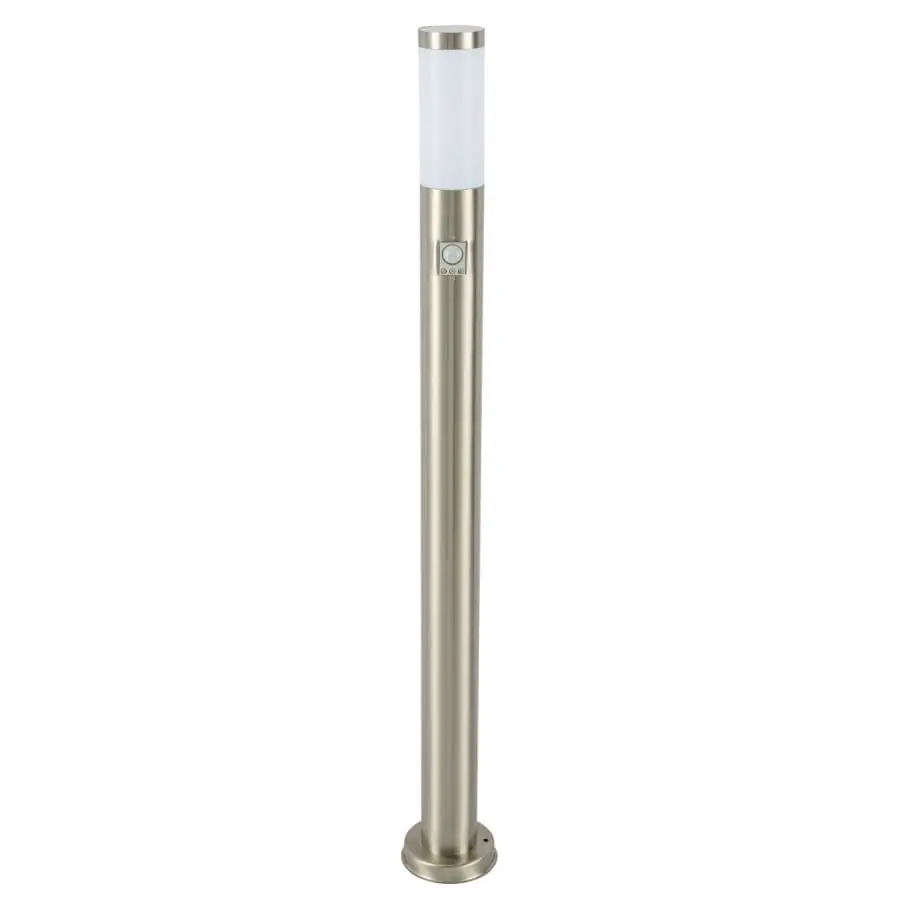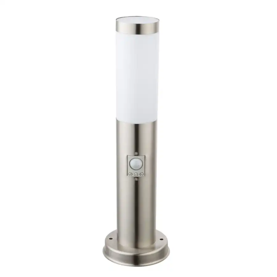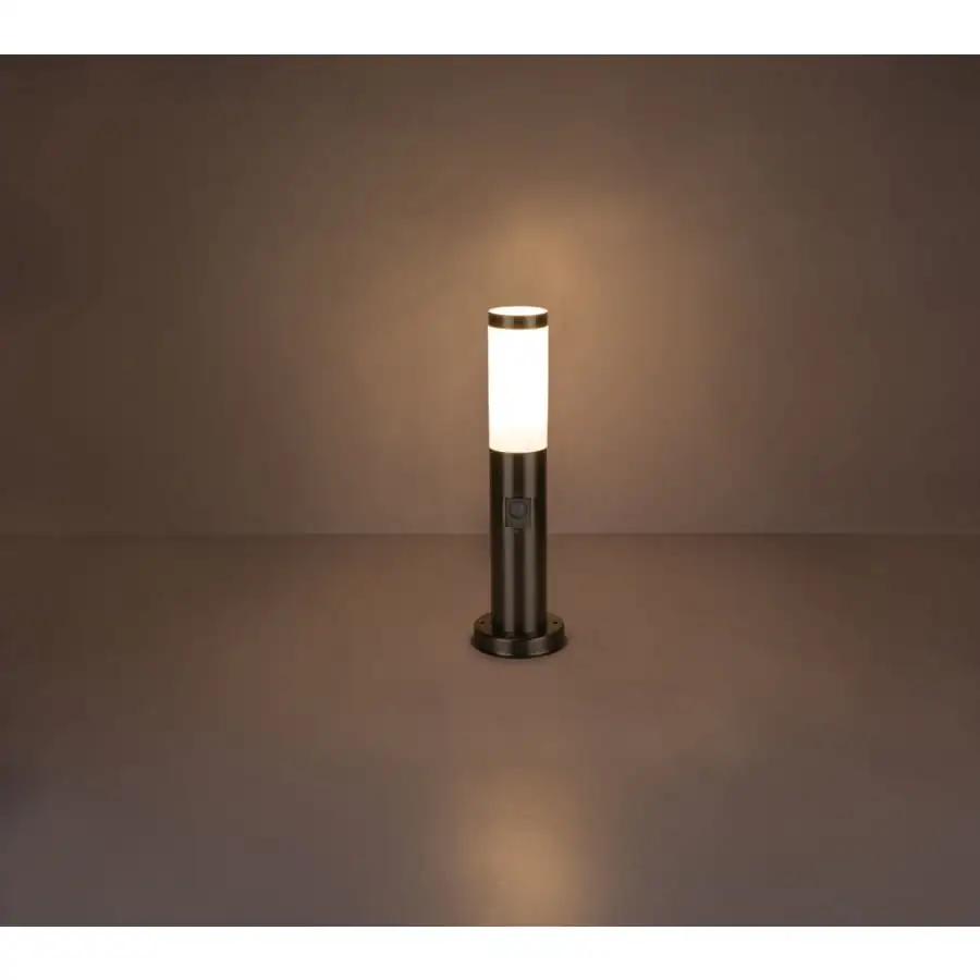 This bollard lamp from the Boston series has a classic design. This outdoor light is made of stainless steel and opal plastic and has a built-in motion sensor (90°, operating radius 0-9 meters). Equipped with an 8.5 W LED lamp. This model has an E27 lamp base, which provides 810 lumens of light (color temperature 3000 K). This light is protected with an IP44 certificate.
