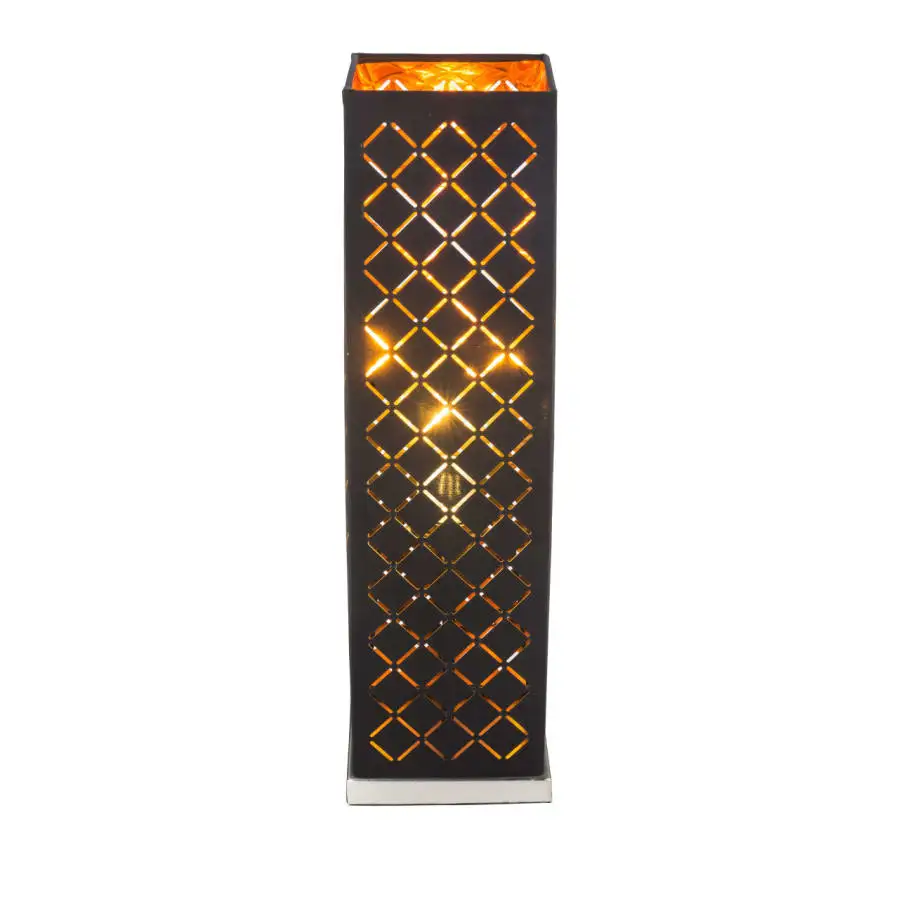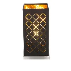 This square, black and gold colored table lamp (10×10 cm) has a unique design. This 57 cm high table lamp is equipped with an E14 socket, which allows you to set the bulb you like (maximum 40 W) to determine the intensity and color of the light. We recommend LED lamps due to their long service life and energy efficiency. A power switch and a 1.5-meter power cord are standard.