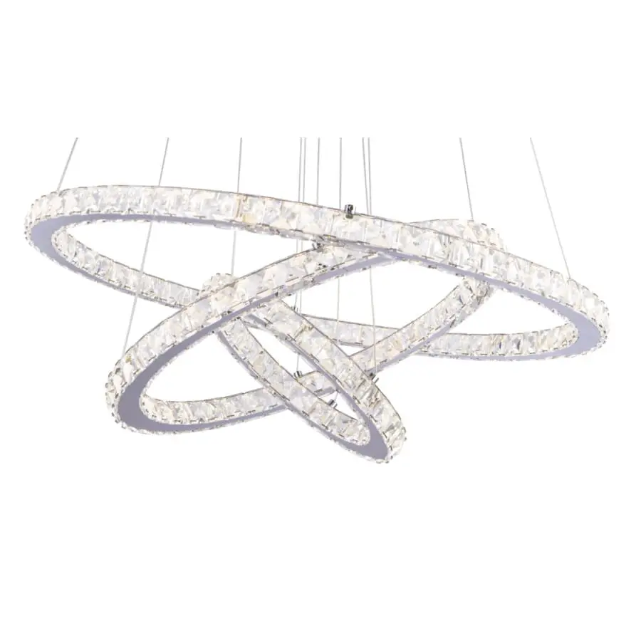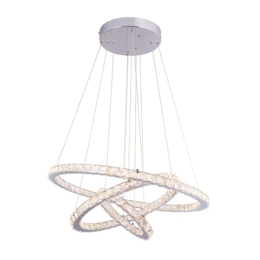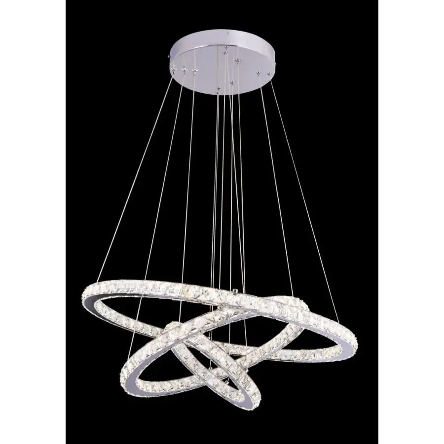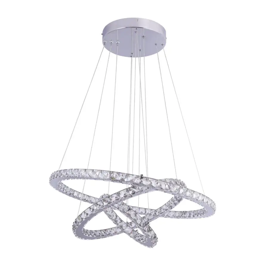 The modern and innovative Marilyn I pendant lamp has three moving light rings of different sizes and attached to each other, decorated with acrylic crystals. The movable chrome pendant lamp produces 3060 lumens of light with an adjustable color temperature of 3000-6000 K. You can complement your interior with other lamps from the same product group.