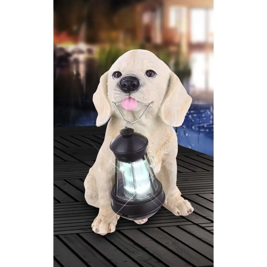 Ett fint prydnadsföremål är en sollampa av beige och vit plast. En hund med en lykta i munnen fångar genast blickarna. Tack vare IP44-skyddet är den 25 cm höga lampan även lämplig för utomhusbruk.