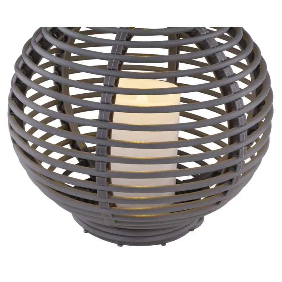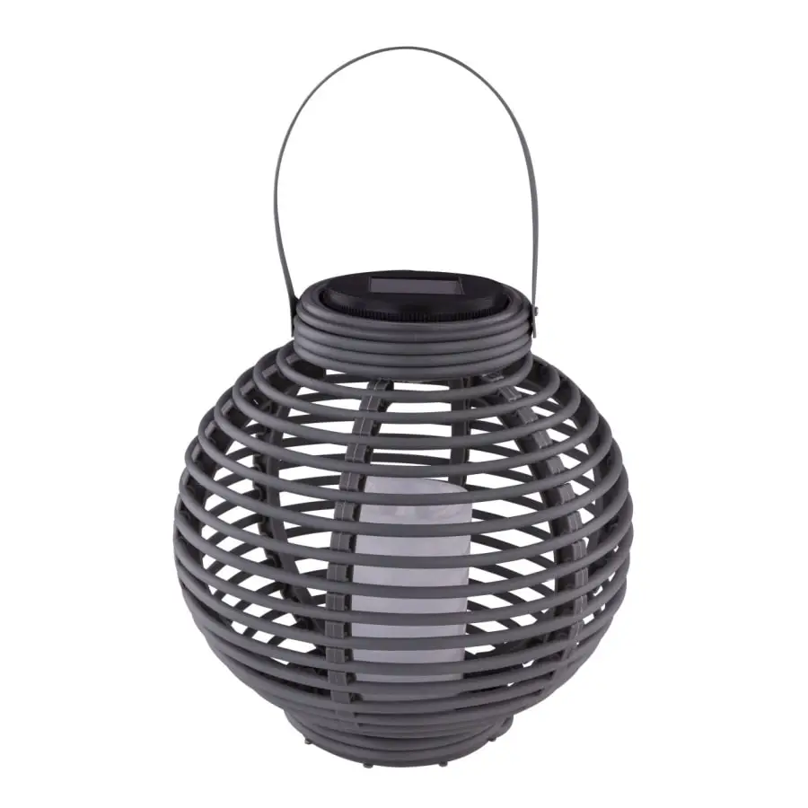 Solcellslampa av grå plast med rottingliknande utseende, innehåller 1 x 0,06 W / 3000 K LED ljuskälla. Höjd ca 23 cm.
