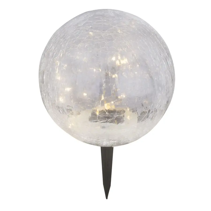 This striking spherical (Ø 19.5 cm) solar lamp is made of clear cracked glass and black plastic. You can attach it to the ground with the supplied ground leg. This solar light has an on/off switch and is fully suitable for outdoor use thanks to IP44 protection. The built-in battery illuminates the LED light sources (20 x 0.06 W) for up to six hours with exciting light.