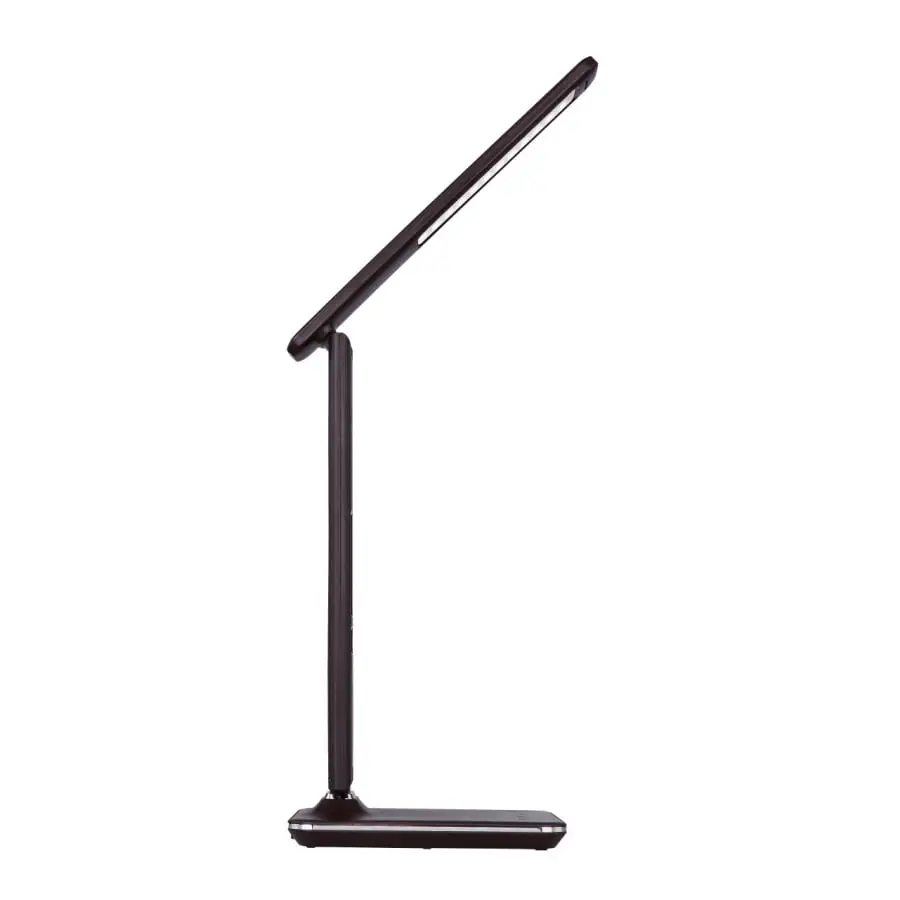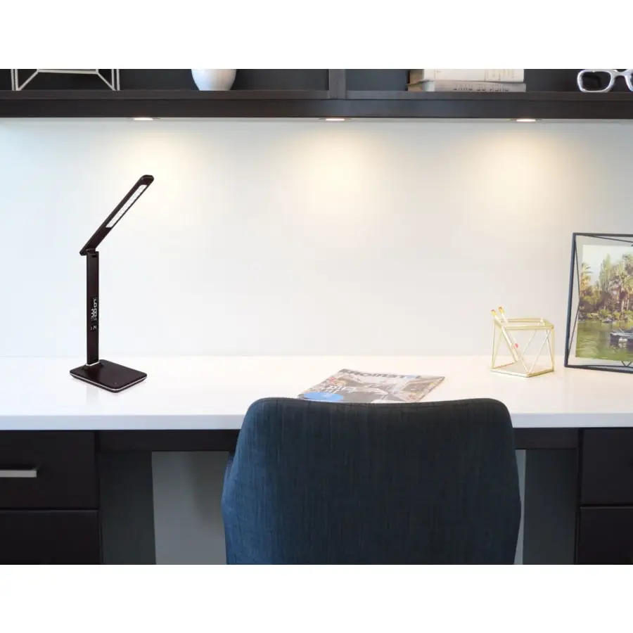 Denna tekniskt sofistikerade bordslampa TANNA är gjord av mörkbrun läderliknande plast med subtila kromelement (ett annat färgalternativ är vitt). Displayen på denna cirka 53 cm höga kontorslampa ger information om tid, datum och temperatur. LED-ljuskällan på 7 watt ger upp till 278 lumen ljus. Färgtemperaturen på ljuset i den dimbara lampan kan justeras i tre steg: varm 3000 K, neutral vit 4500 K och kall 5500 K. Bordslampan fungerar genom beröring. Den vackra inomhuslampan passar alla sovrum och lounger.