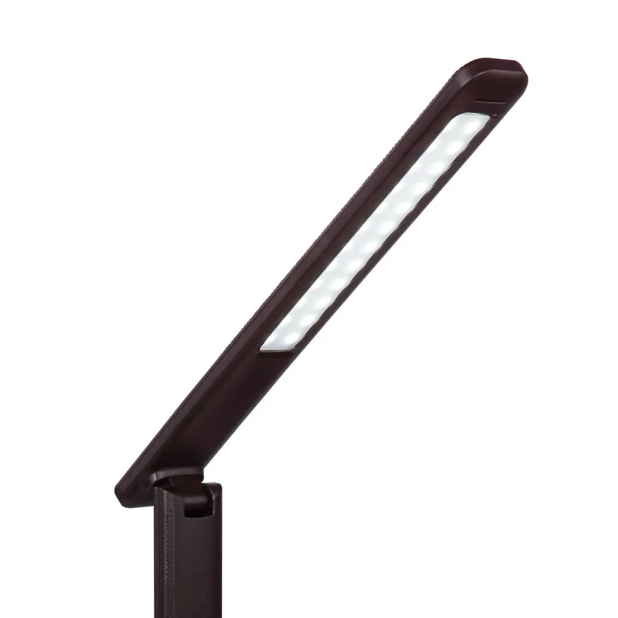 This technically sophisticated table lamp TANNA is made of dark brown leather-like plastic with subtle chrome elements (another color option is white). The display of this approximately 53 cm high office lamp provides information about the time, date and temperature. The 7 watt LED light source offers up to 278 lumens of light. The color temperature of the light of the dimmable lamp can be adjusted in three stages: warm 3000 K, neutral white 4500 K and cold 5500 K. The table lamp works by touch. The beautiful indoor lamp is suitable for all bedrooms and lounges.