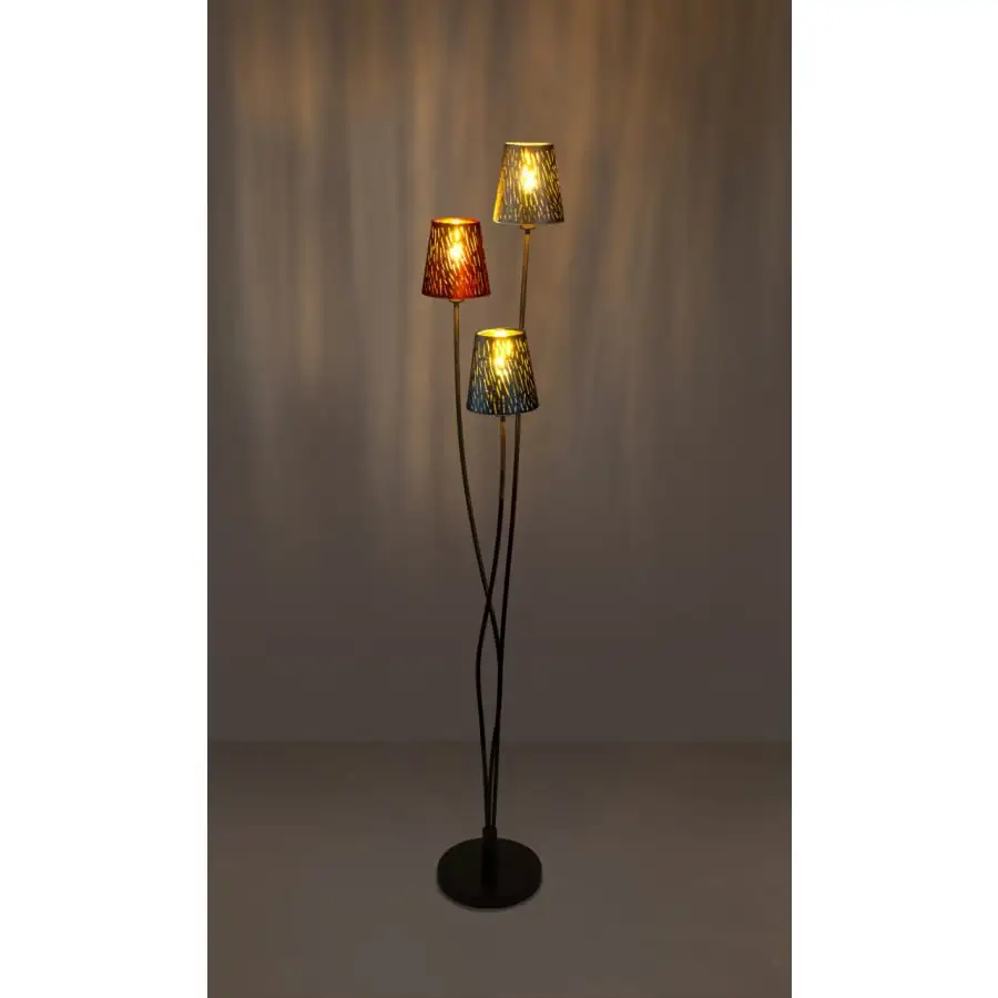 Detta är en 1,5 meter hög Tarok golvlampa. Dess lampskärmar reflekterar ljuset imponerande. Dessutom har denna modell en strömbrytare och tre E14-lampsocklar, så den kan förses med lämpliga glödlampor (max 25 W). För energibesparing och livslängd rekommenderar vi LED-lampor.