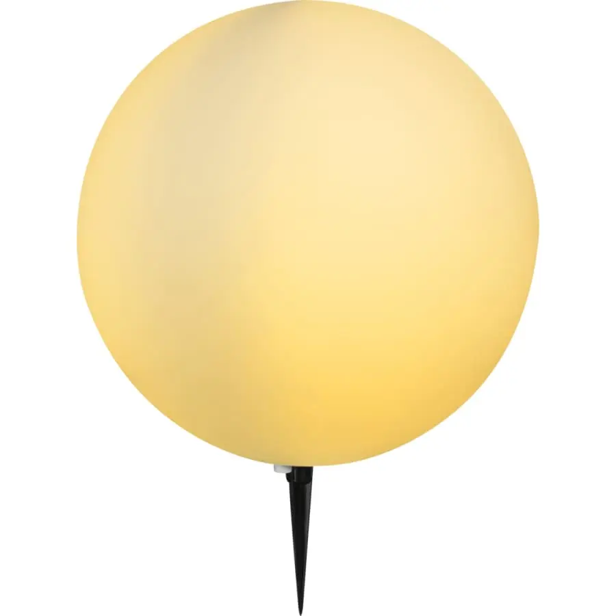 Ball lamp Toula made of white plastic with a mounting base and a five-meter long cable. Due to its beautiful appearance, the ball lamp is an eye-catcher in every garden. Its E27 lamp base allows the use of any light bulb (up to 30 W) and its IP44 protection makes this garden lamp suitable for outdoor use.