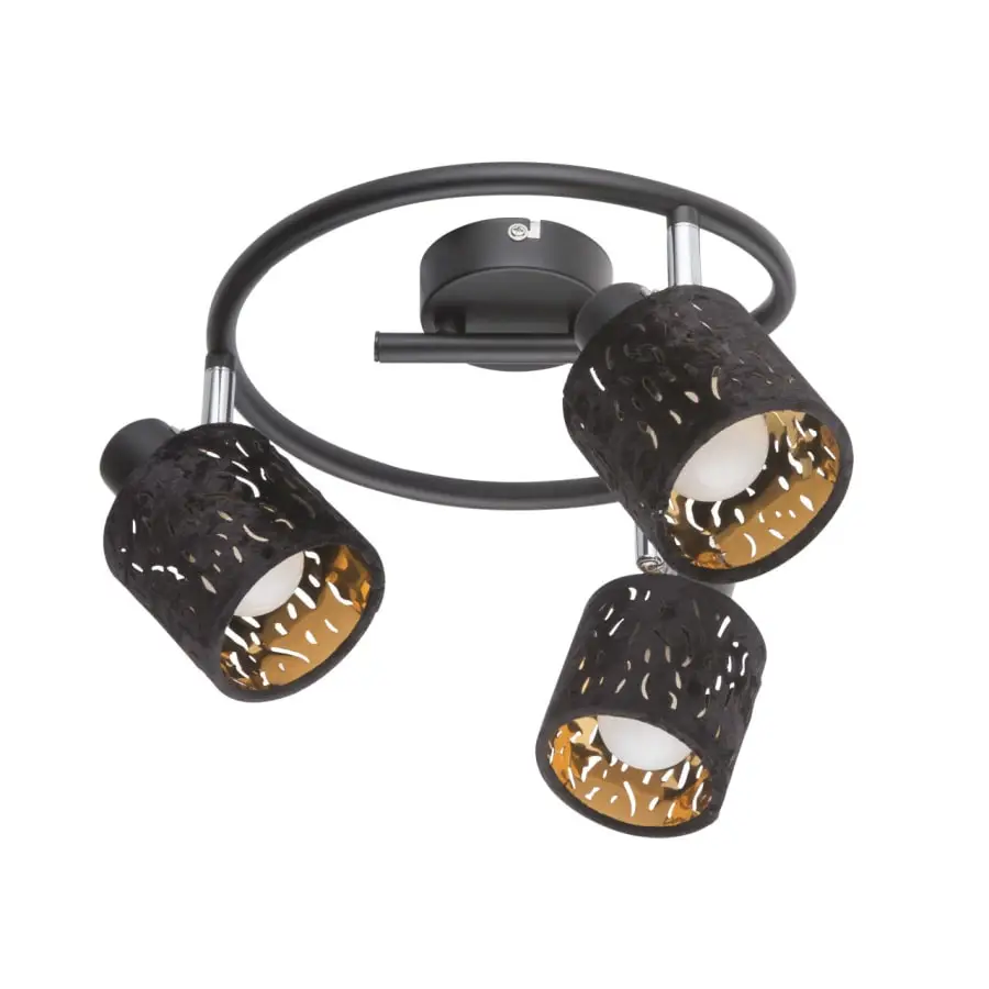 The stylish Troy series spotlight has high-quality materials. Black metal and individual chrome and gold-plated parts complete this lamp and make it a real eye-catcher. All three light spots have an E14 connector, which allows you to choose the desired wave sources and thus also the light intensity and light color (max. 8 W). With the help of other models in this series, you can complete your premises.