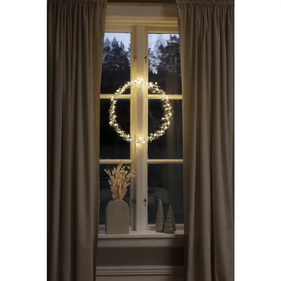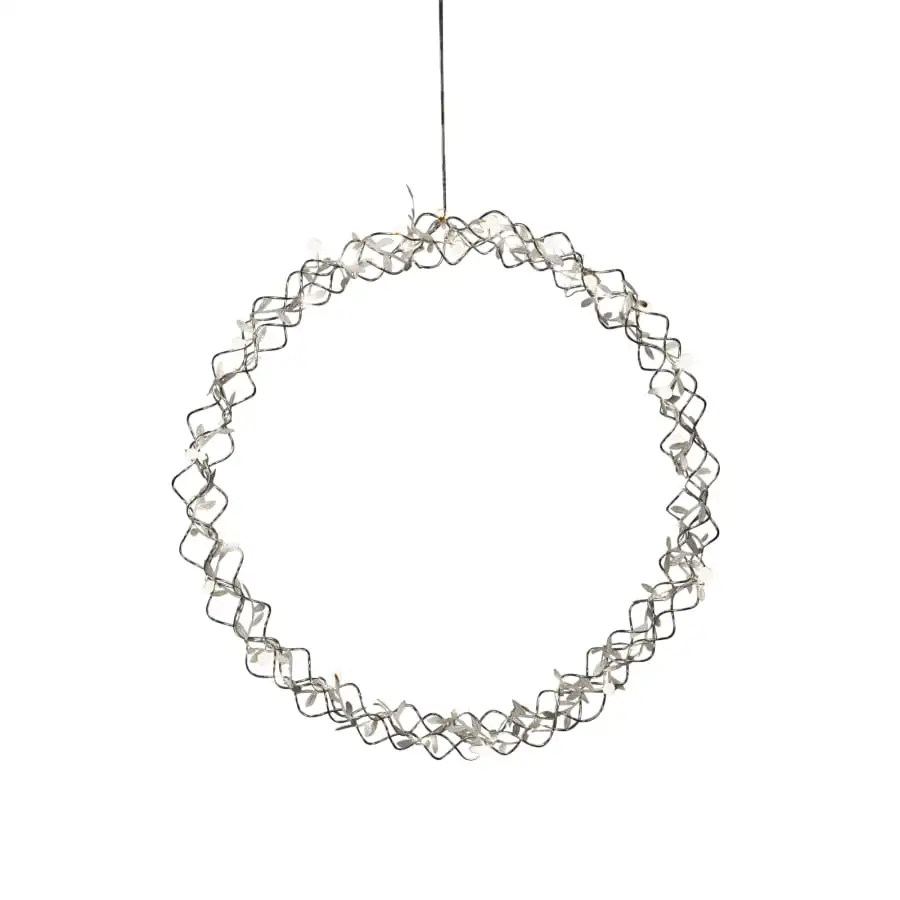 Pärlkrans silverfärgad, dia 45 cm. För inomhusbruk. I Kranss, 40 varmvita. Lysdioder och bladdekorationer. Anslutningskabellängd 5 m, transformator.