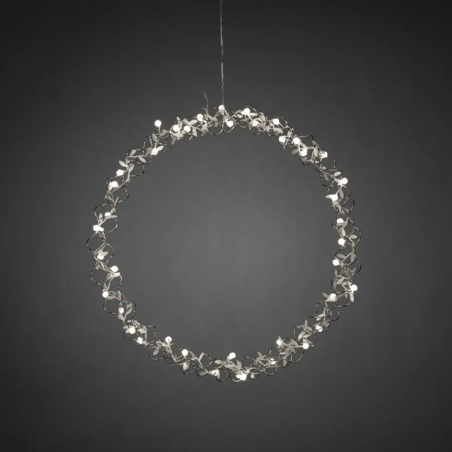 Pearl wreath silver-colored, dia. 45 cm. For indoor use. In Kranss, 40 warm white. LEDs and leaf decorations. Connection cable length 5 m, transformer.