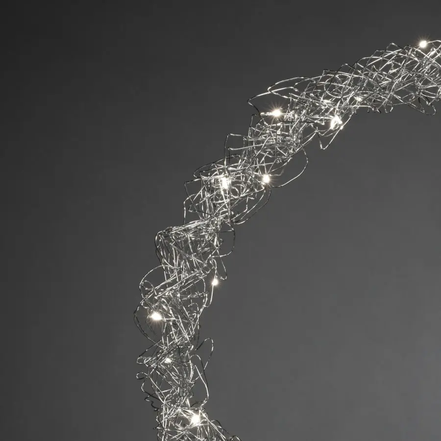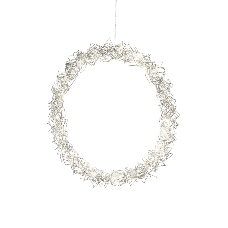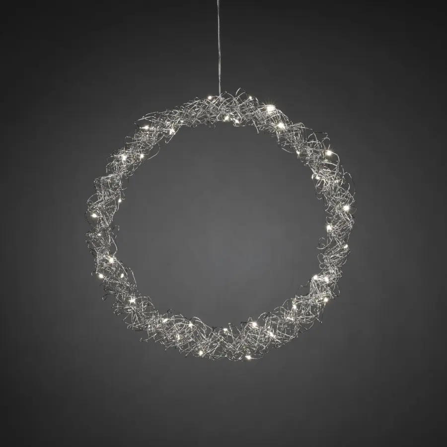 Silver metal wreath, diameter 45 cm. For indoor use. Kranssisa 40 warm white. LEDs. Connection cable length 5 m, transformer.