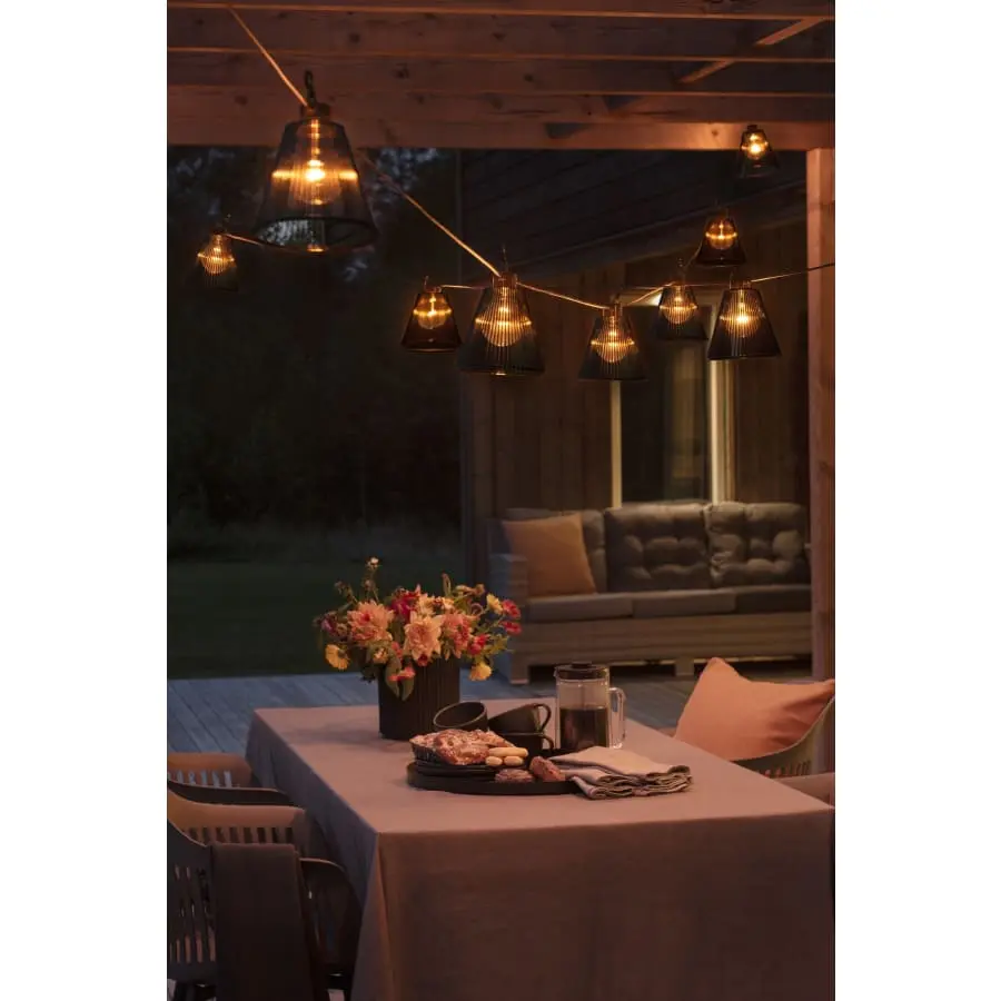 Setet innehåller 10 bärnstensfärgade LED-lampor och avtagbara svarta skärmar.