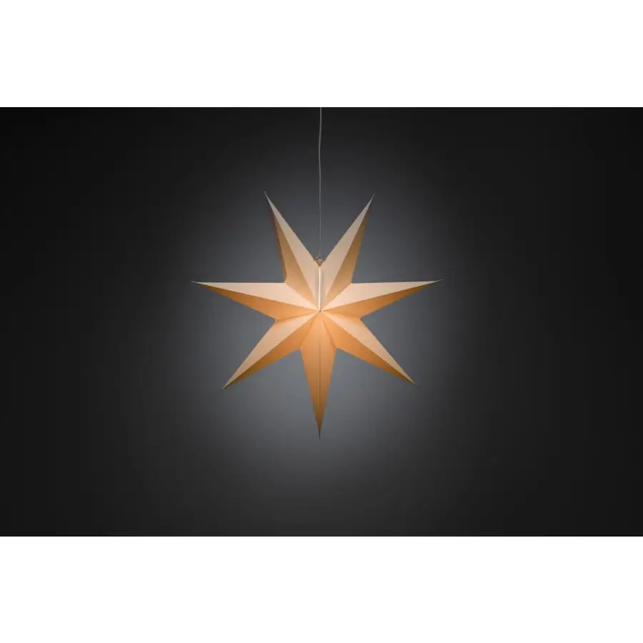 Vit 60 cm 7-uddig pappersstjärna. Längden på anslutningskabeln är 5 m med en mellanströmbrytare och en upphängningsögla. Anslutningssladden kommer med en ”twister”, med vilken stjärnan enkelt kan hängas rak.