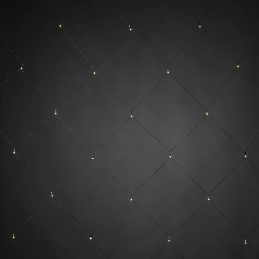 Light grid 3×3 m with 96 warm white LEDs, the end of which is frosted. Black cable. The length of the connection cable is 1000 cm. Transformer 24 V. For outdoor use, IP44.