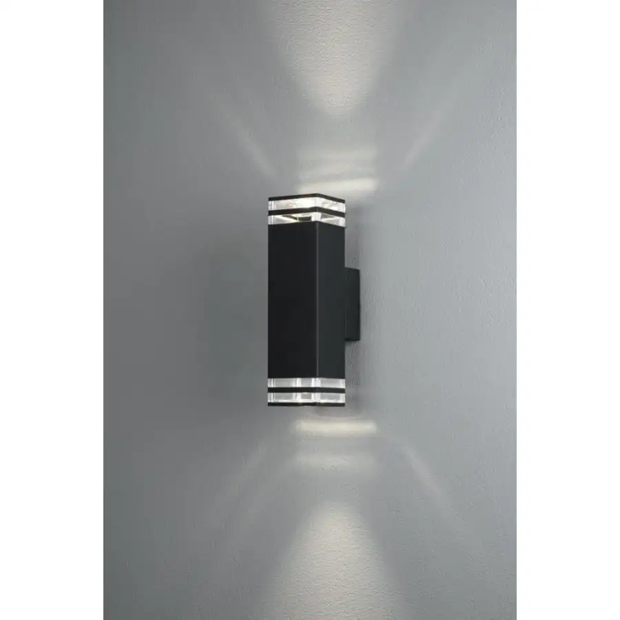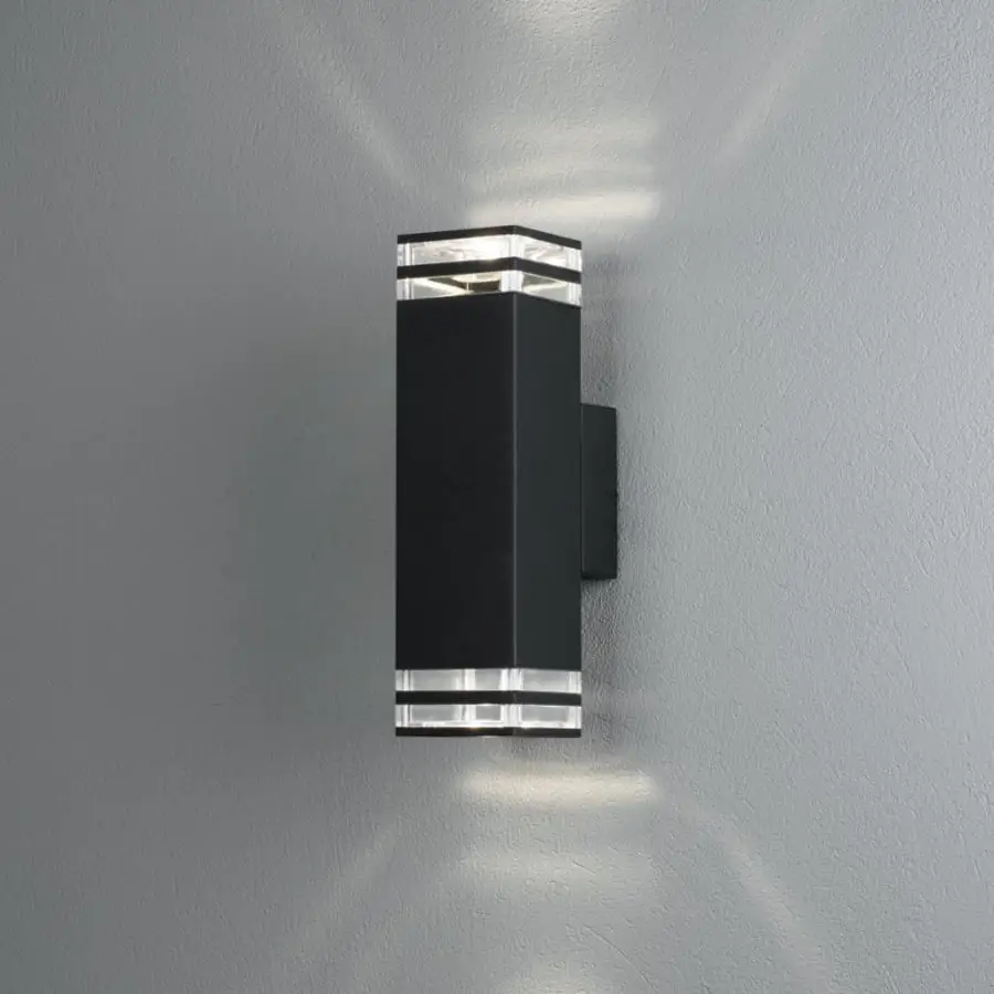 Konstsmide Pollux 408-750 utomhusvägglampa, IP44, längd 11,5 cm, bredd 7,5 cm, höjd 27,5 cm, klar akryl, kropp aluminium, kroppsfärg svart, fyra akrylränder, glödlampa GU10 max 2x7W ingår ej, glödlampa max höjd 85 mm, uppåt -nedljus