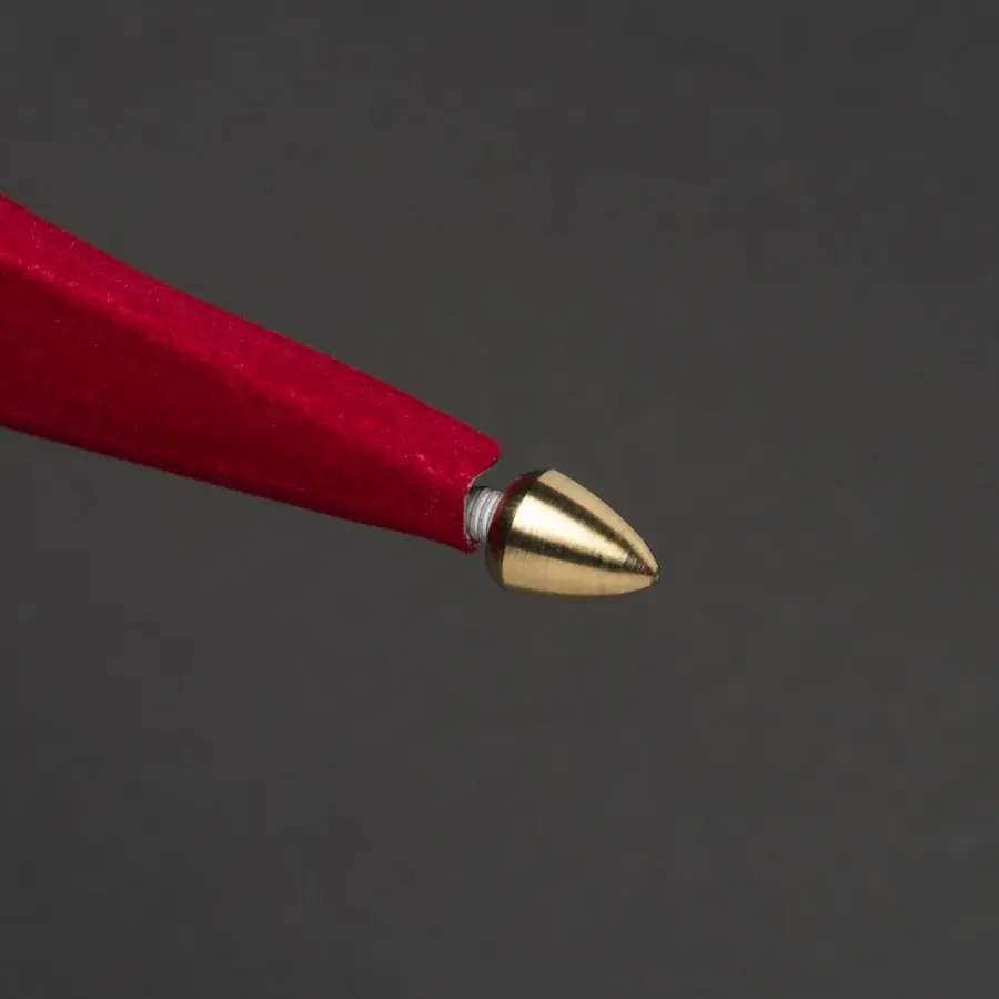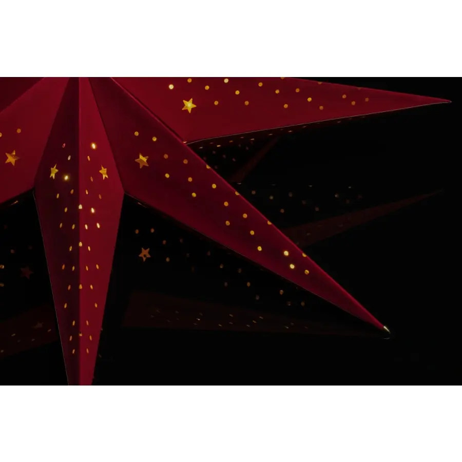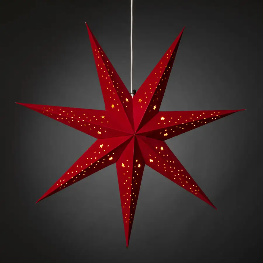 7-uddig pappersstjärna 78×78 cm. Röd sammetsyta och gyllene insida. Längden på den vita anslutningskabeln är 500 cm. Strömbrytare i täten. Lampfot E14. Glödlampa ingår ej. 230 V. För inomhusbruk, IP20.