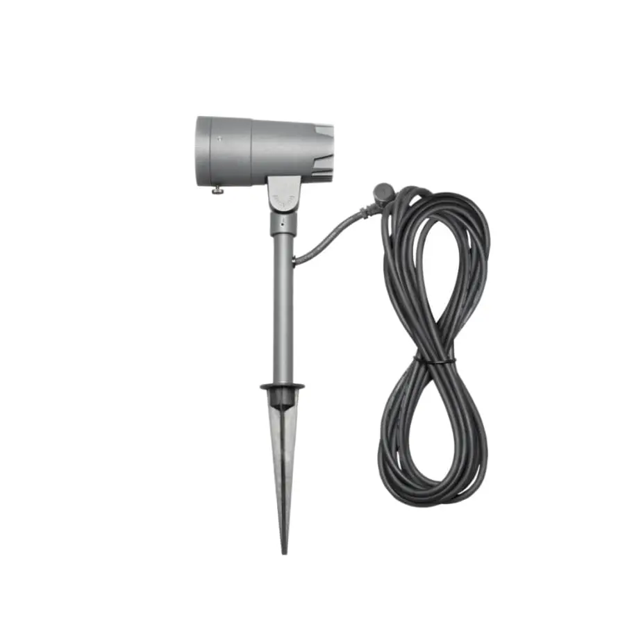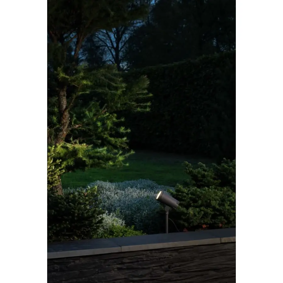 Konstsmide 12V serie Andria 7475-370 trädgårdsspotlight, IP44, längd 13,5 cm, bredd 7 cm, höjd 27 cm, klar akryl, ram aluminium, ramfärg mörkgrå, fast LED 3W, 210lm, 3000K, anslutningskabel 2+8 m, 12V /12W transformator, justerbar vertikal orientering 150 grader, reservtransformator kan beställas separat med kod 7483-000, lampan kan användas ensam eller den kan anslutas som en del av Konstsmidens 12V system, till vilken det går att ansluta flera olika typer av lampor och tillbehör