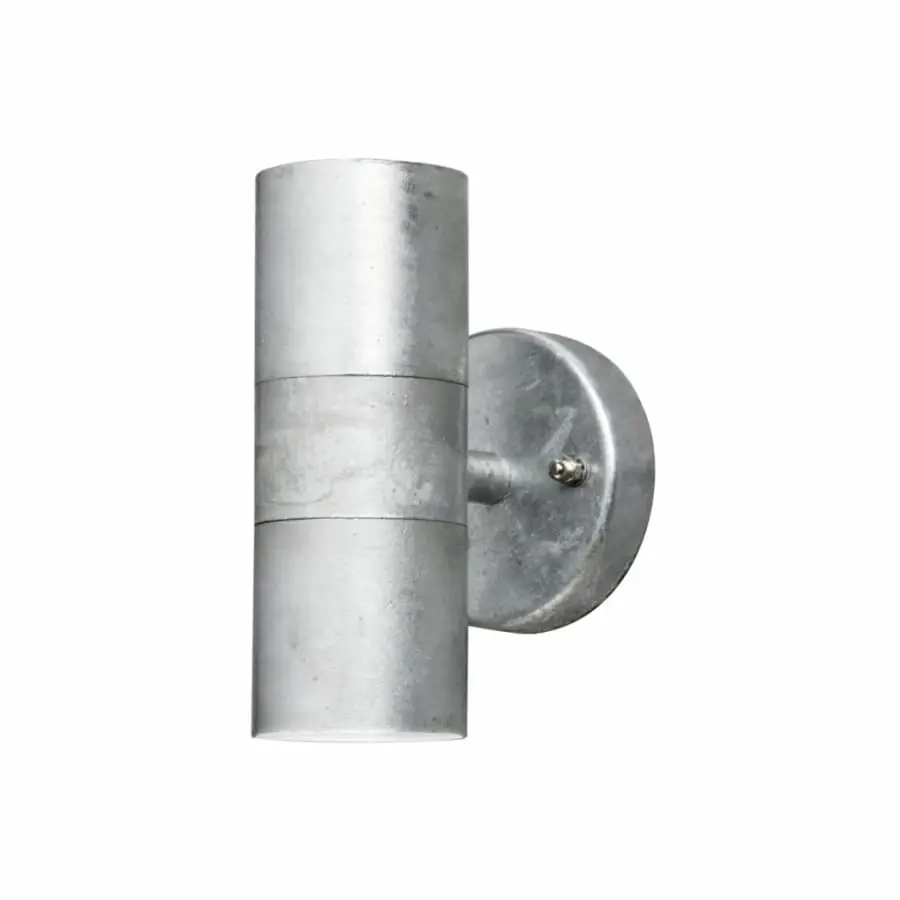 Konstsmide Modena 7571-320 utomhusvägglampa, IP44, längd 9 cm, bredd 6 cm, höjd 17 cm, klarglas, stålkropp, karossfärg galvaniserat stål, glödlampa GU10 max 2x35W ingår ej, glödlampa max höjd 64 mm, upp och ner lätt, utanpåliggande kablage monteringssockel 449-250/750 kan beställas separat