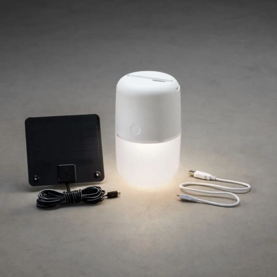 Konstsmide Assisi SOLAR 7805-202 mood lamp, IP44, length 12 cm, width 12 cm, height 19.5 cm, body plastic, body color white/white, fixed LED 1x1W, 100/40/10lm, 3000K, dimmable, works with solar cell charging or With USB cable, burn time 15h with full battery charge
