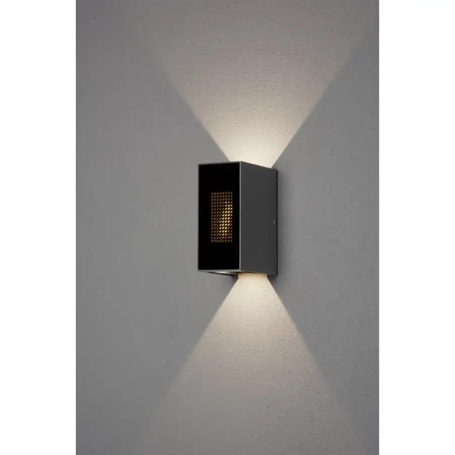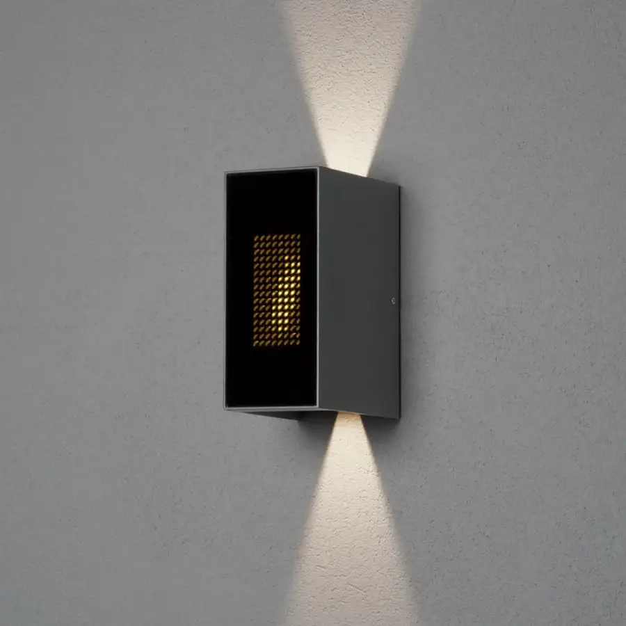 Konstsmide Cremona 7866-370 utomhusvägglampa, IP54, längd 13,5 cm, bredd 8 cm, höjd 17 cm, klarglas, aluminiumstomme, kroppsfärg mörkgrå, 450lm, fast LED 2x3W+0,5, 3000K, ljusets öppningsvinkel kan justeras 0 mellan -90 grader, push-in kopplingsdosa, kan kedjas, kan utanpåliggande monteras, flamliknande led-ljus synligt i framsidan av lampan, som kan justeras med medföljande fjärrkontroll
