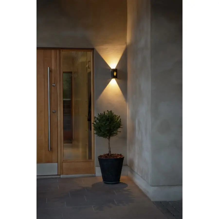 Konstsmide Cremona 7866-370 outdoor wall lamp, IP54, length 13.5 cm, width 8 cm, height 17 cm, clear glass, aluminum body, body color dark gray, 450lm, fixed LED 2x3W+0.5, 3000K, the opening angle of the light can be adjusted 0 between -90 degrees, push-in connection box, can be chained, can be surface mounted, flame-like led light visible in the front of the lamp, which can be adjusted with the included remote control