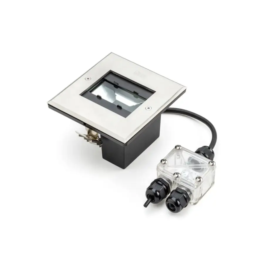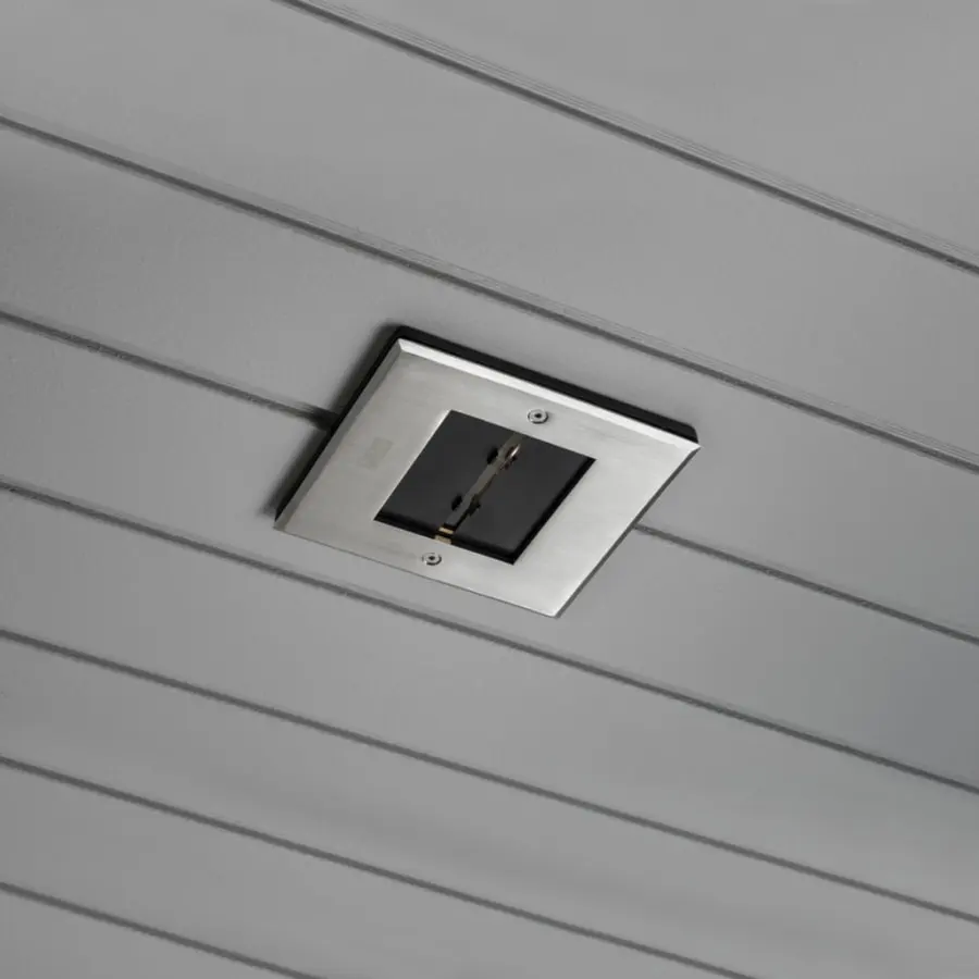 Konstsmide Recessed 7993-310 räystäsvalaisin, IP44, pituus 14,5 cm, leveys 13,5 cm, korkeus 8,5 cm, kirkas lasi, runko terästä/alumiinia, rungon väri ruostumaton teräs, 550lm, vaihdettava LED 1x6W, 3000K, sopii himmennettäväksi, säädettävä valon avautumiskulma, voidaan ketjuttaa