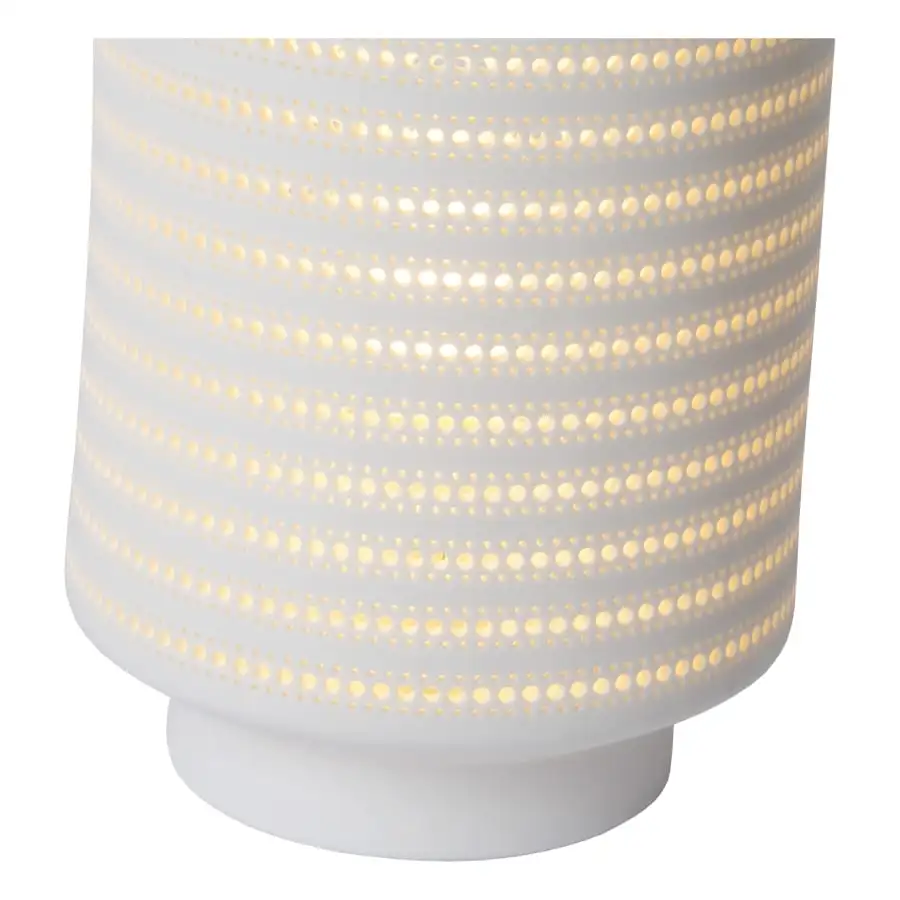 Möt Jamila: lantlig lyx i form av en bordslampa. Jamila tar med ett traditionellt värmeljus i ett nytt yttre skal. Porslinsskärmens stora och små hål skapar ett underbart ljusspel. En snygg kvinna som Jamila har ett öga för detaljer. Det är därför handtaget är av trä. Jamila är 25 centimeter hög och lätt att slå på och av med en strömbrytare. Finns i olika färger.