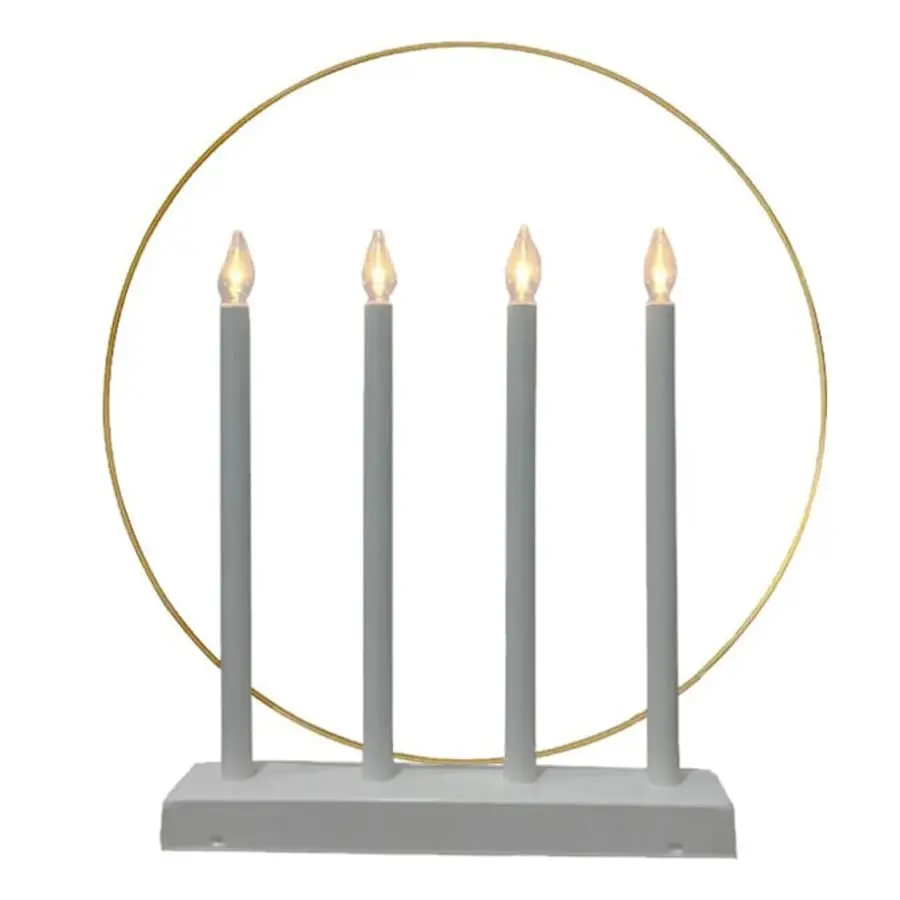 Vacker vit 4-grenad led-ljusstake med varmt och behagligt vitt ljus. En vacker guldring i ljusstaken. Ljuset har en vit 180cm nätsladd med strömbrytare.