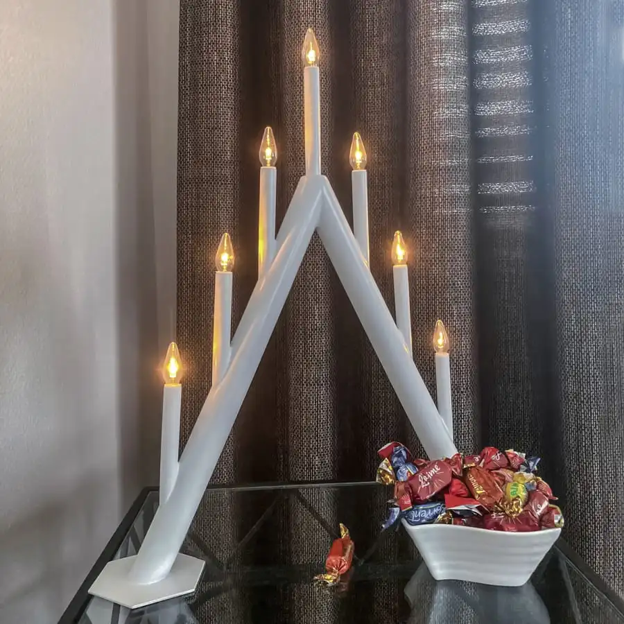 Tall and modern metal 7-branch candlestick with replaceable led lights. The candle has a warm white light. The candle has a 180cm white power cord with a switch.