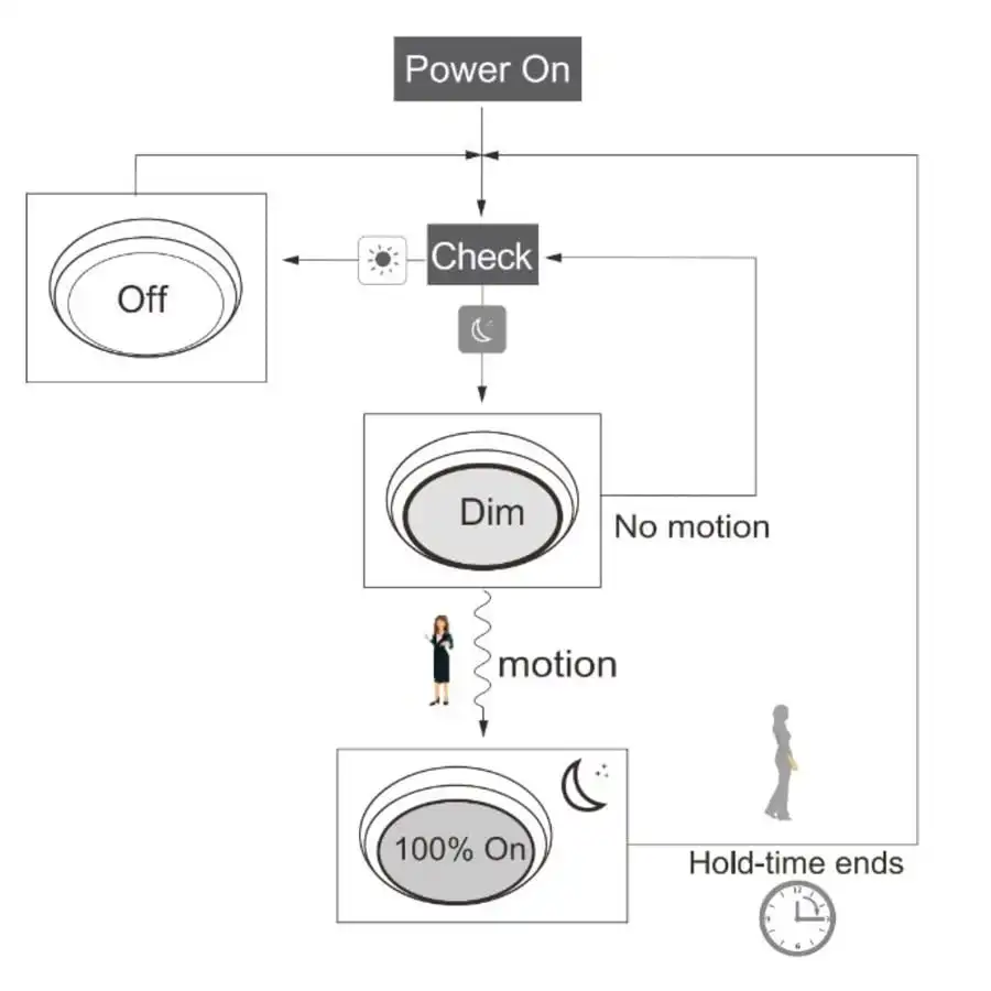 Käyttämällä hämäräkytkin- / liiketunnistinsensoria voit käyttää syväsäteilijöitä entistäkin energiatehokkaammin. Vakioasetuksilla valaisin syttyy kun hämäräkytkin tunnistaa valon tarpeen. Kun tunnistin havaitsee liikkeen, syttyy valo täyteen tehoonsa. Kun tunnistin ei havaitse liikettä viiteen minuuttiin, himmenee valo ensin energiansäästötilaan, ja lopulta 15 minuutin jälkeen sammuu kokonaan, mikäli liikettä ei edelleenkään ole havaittu. Erikseen hankittavalla kaukosäätimellä voit säätää tunnistusaikoja sekä -herkkyyttä, ja lisäksi voit säätää eri toimintatiloja ja valon kirkkautta.