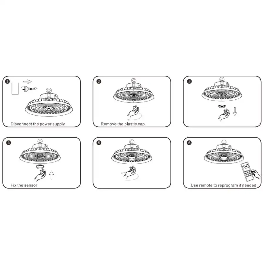 By using the daylight sensor / motion detector sensor you can operate your Lumio Lights MULTI high bay lights with even better energy efficiency. With standard settings the light will switch on when the daylights sensor recognizes inadequate ambient light. When the motion detector sensor detects motion, the light will switch to full brightness. After five minutes of not detecting any motion, the light will first dim to energy saving mode, and finally after 15 minutes of not detecting any motion switch off completely. By using a separately sold remote controller you can adjust the times and sensitivity of the sensor, and also set different operation modes and adjust the light brightness.
