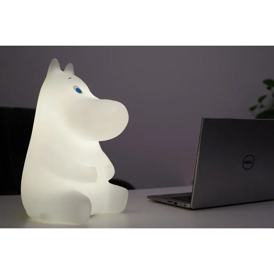 Mumin LED-lampan är en sympatisk och lugnande ljuskälla. Muminlampan är lätt att tända och släcka med ett tryck. Genom att trycka på ljuset kan du även justera ljusstyrkan på lampan, och det finns fem ljusstyrkanivåer. Muminlampan fungerar med både mikro-USB och batterier. Ytan är behagligt slät och giftfri silikonplast.