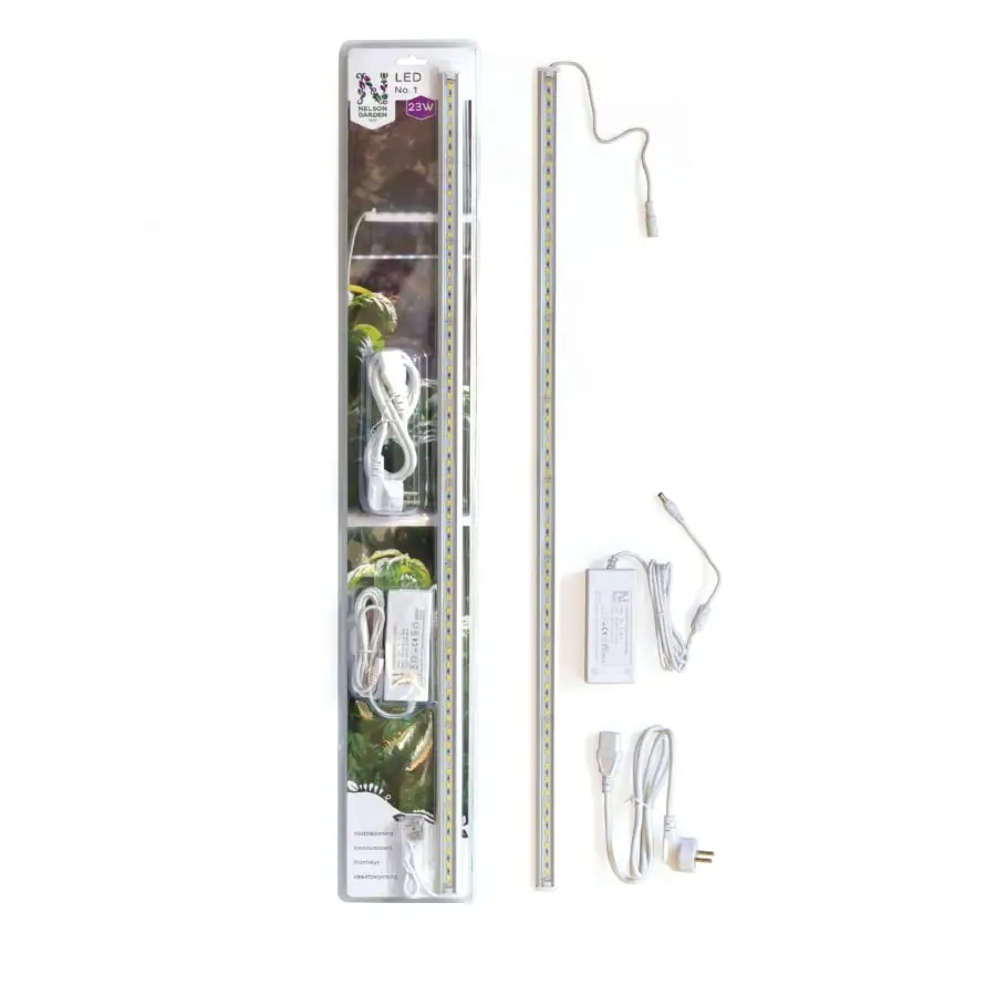 Energiaa säästävä LED-lista ja muuntaja. Listaan voidaan kytkeä yksi LED-lisälista (LED No.2, tuotenro 5569). Sopii esikasvatukseen ja lisävaloksi sisäviljelmille. Pit. 85cm, 23W, 230V, 6400K, nimellinen valovirta 2200 lm, nimellinen palamisaika 35000h, PPFD (100 mm) 141 µmol/s/m².